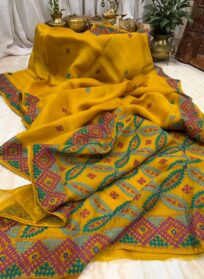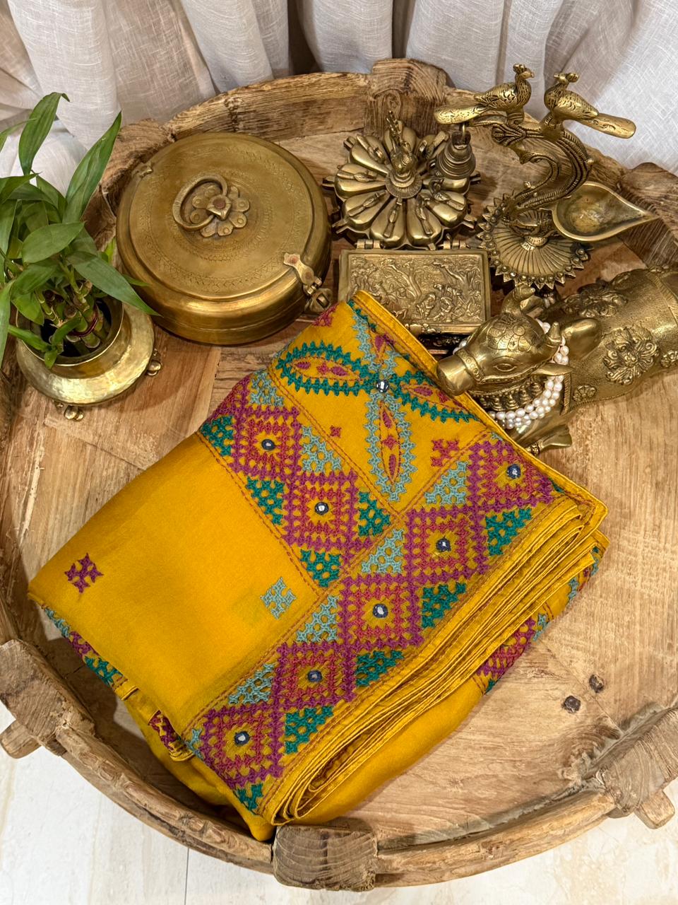 Mustard Organza Silk Saree with Kutch Embroidery