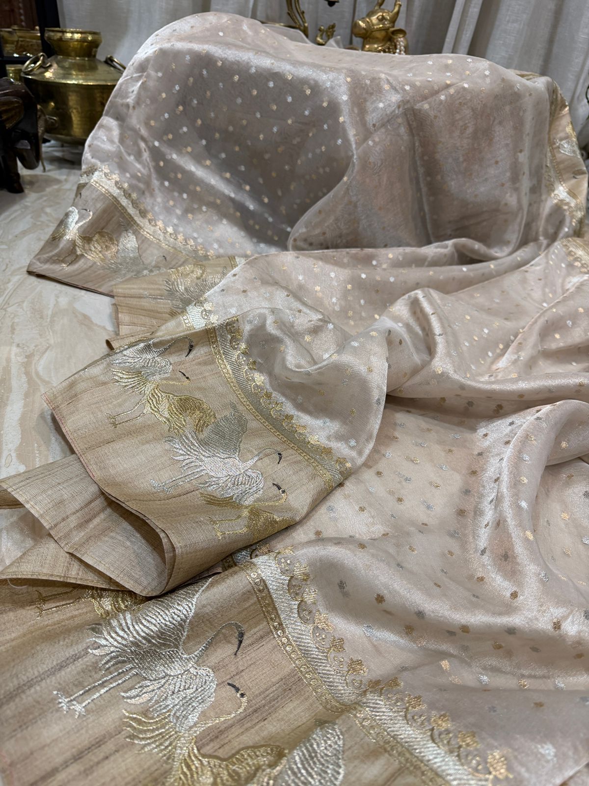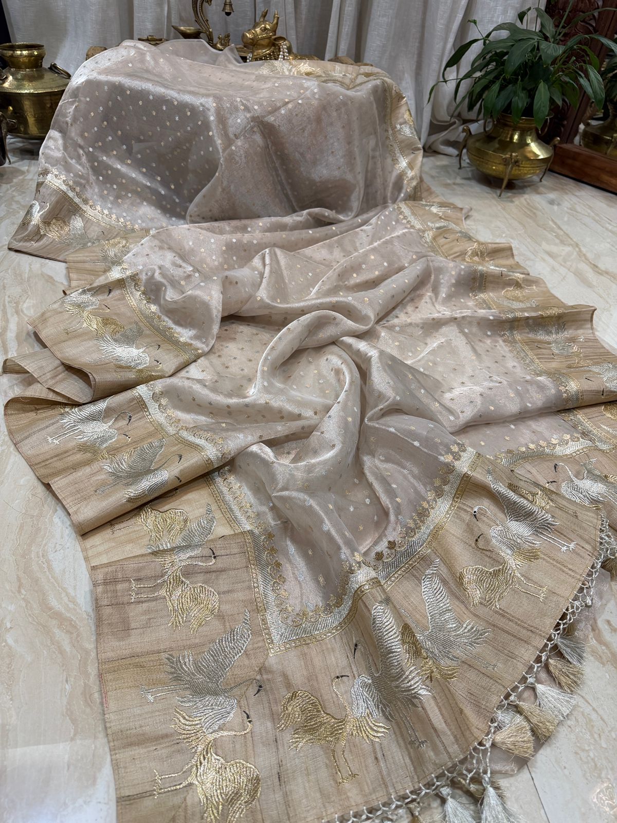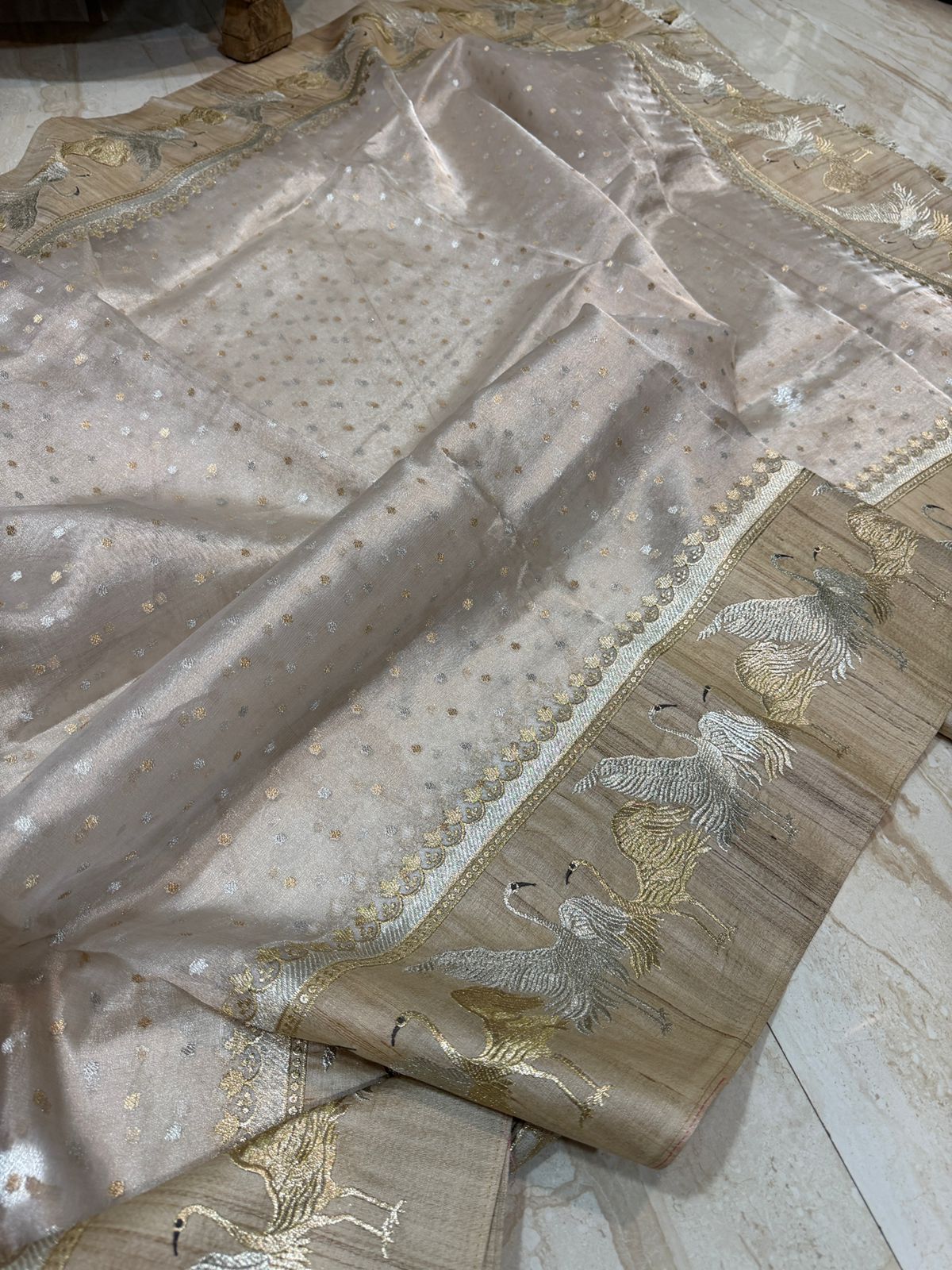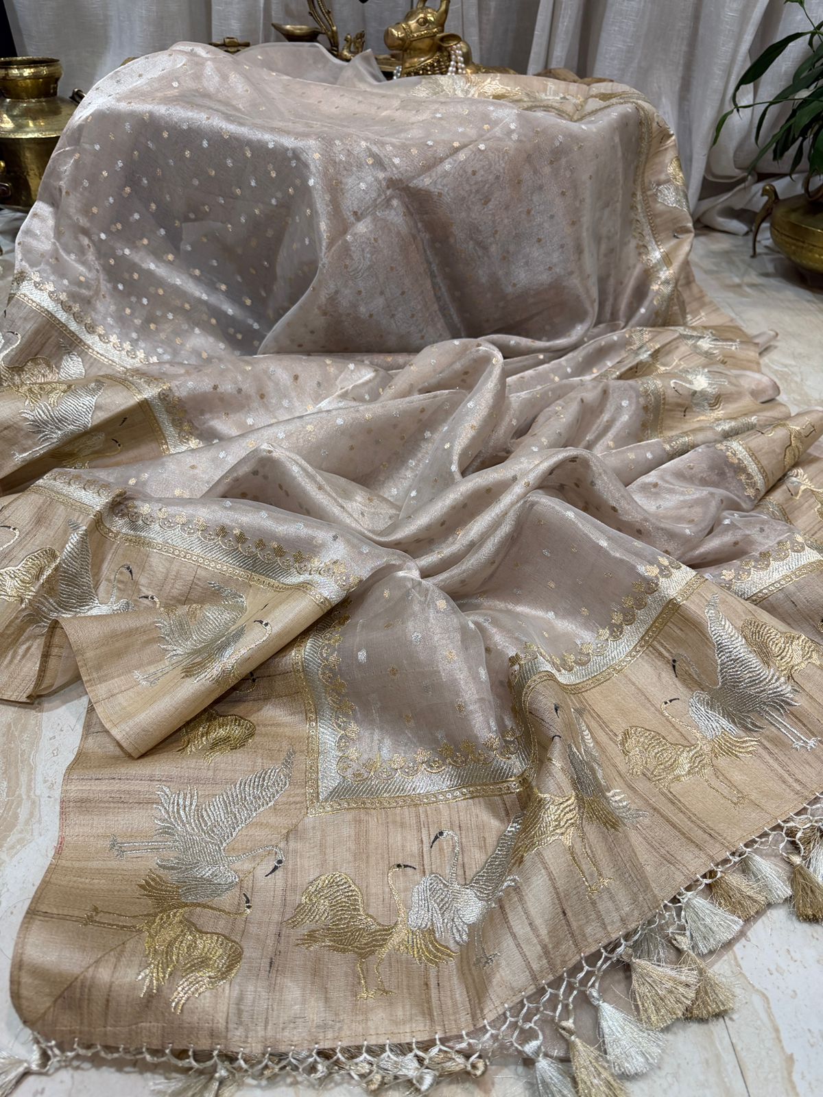 A rich Tussar silk border, beautifully embellished with elegant crane motifs, and finished with handcrafted tassels that add a regal, handcrafted charm.