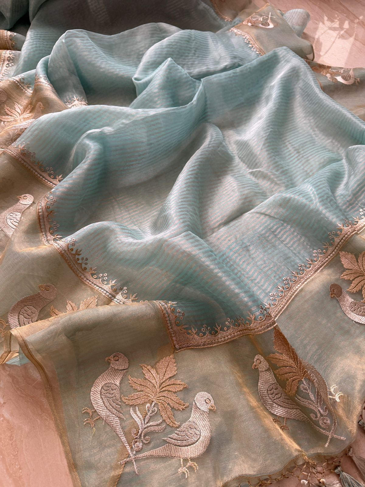 The highlight is the rich woven border featuring delicate bird and floral motifs inspired by traditional Banarasi artistry. Finished with handcrafted tassels, this saree adds a festive and luxurious touch without being heavy.