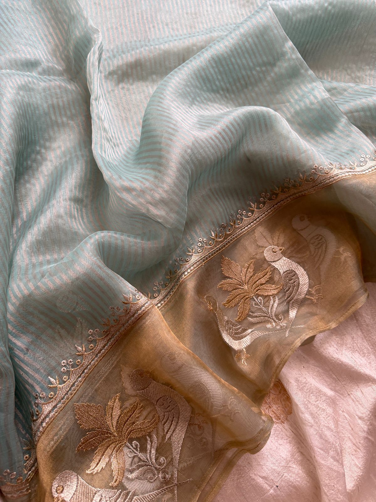 This beautiful Banarasi tissue saree comes in a soothing shade with a graceful, lightweight drape. The sheer tissue base has a soft shimmer that looks very elegant and classy.