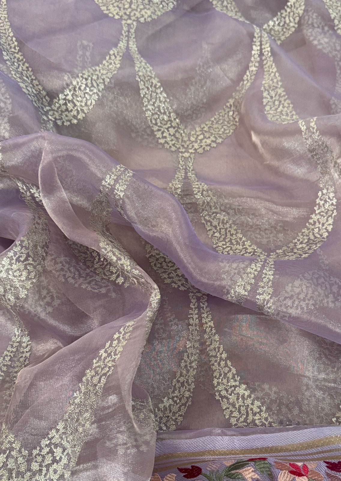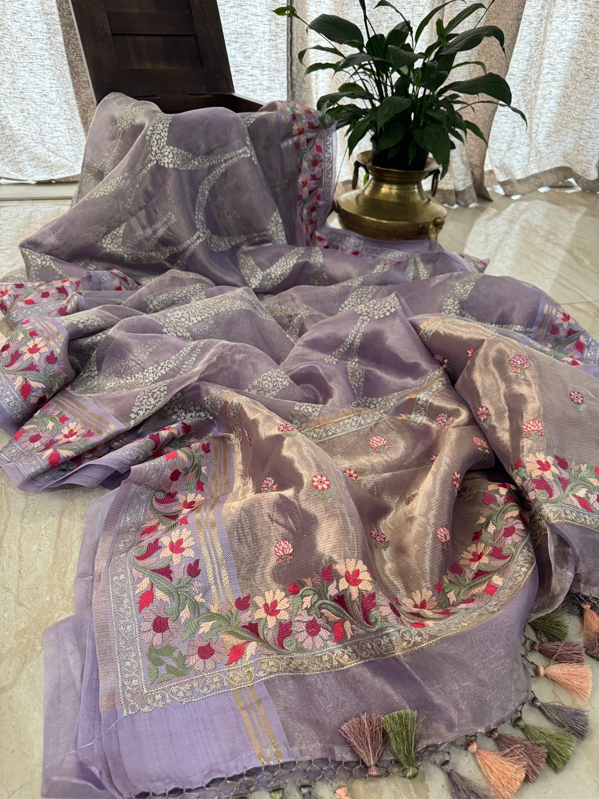 Experience sheer elegance with our Exclusive Banarasi Soft Tissue Silk Saree, a true masterpiece that blends traditional craftsmanship with contemporary grace. The saree features intricate all-over embroidery that enhances its rich Banarasi texture, while the Katan silk border adorned with multi-floral embroidery work adds a luxurious touch.