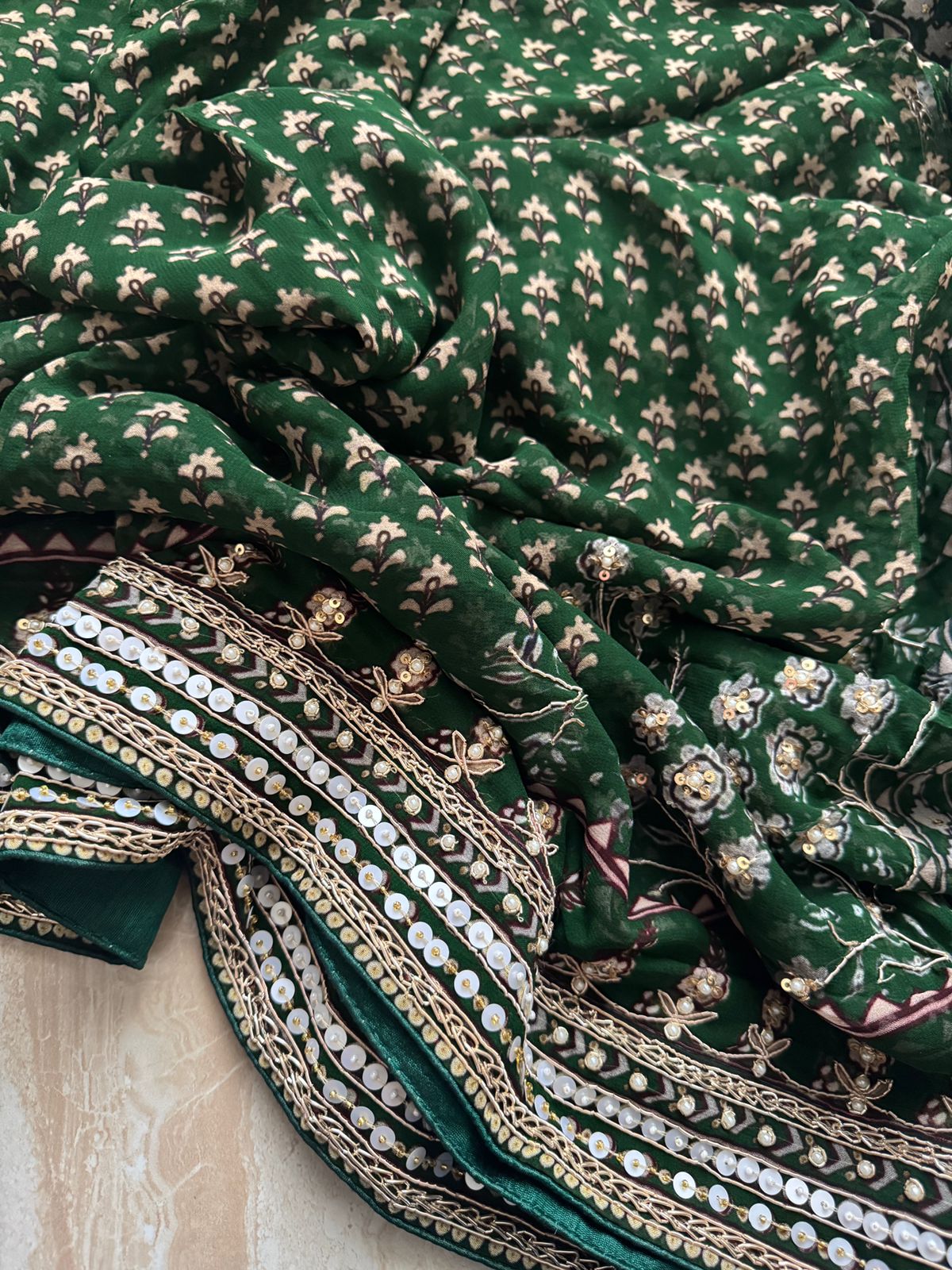 A perfect blend of tradition and elegance, this saree features a rich Ajrakh print on soft georgette fabric. The highlight is its handcrafted zardozi embroidery border, intricately done with finesse to add a regal charm. Lightweight, graceful, and timeless – this saree drapes beautifully, making it ideal for festive occasions, weddings, or special gatherings.