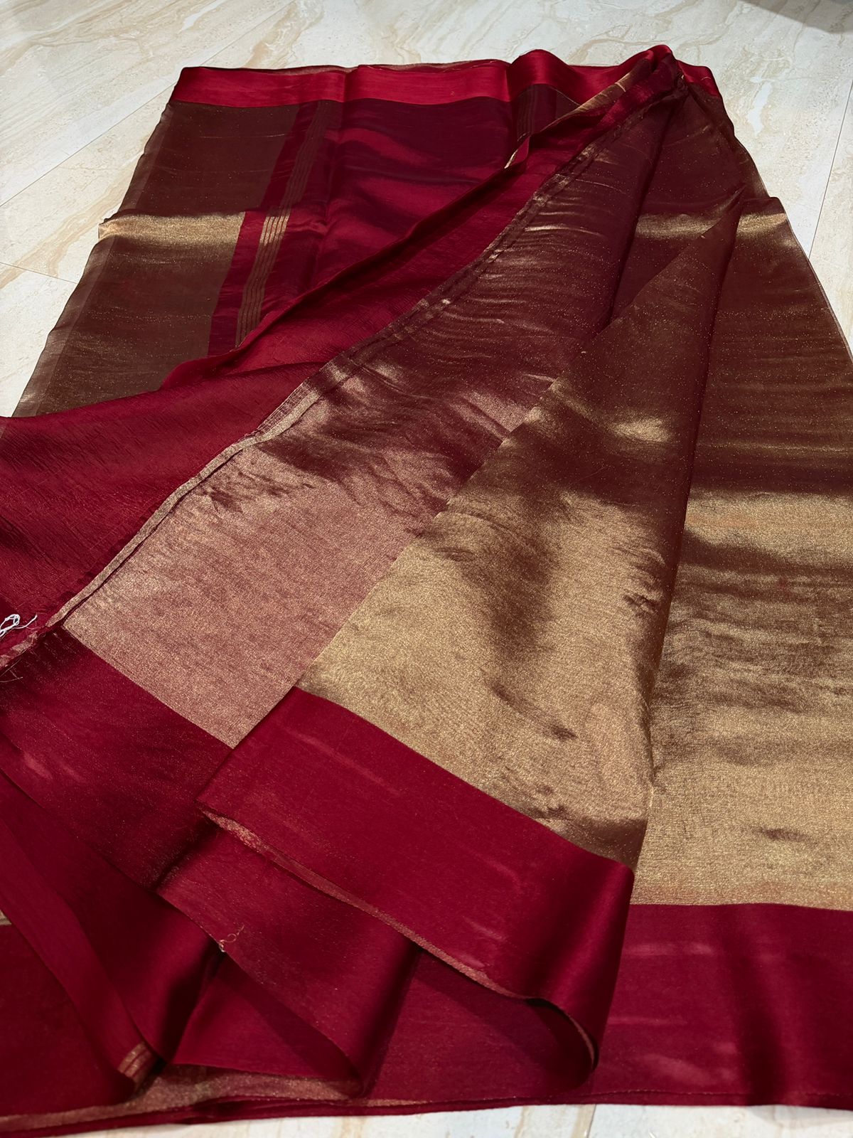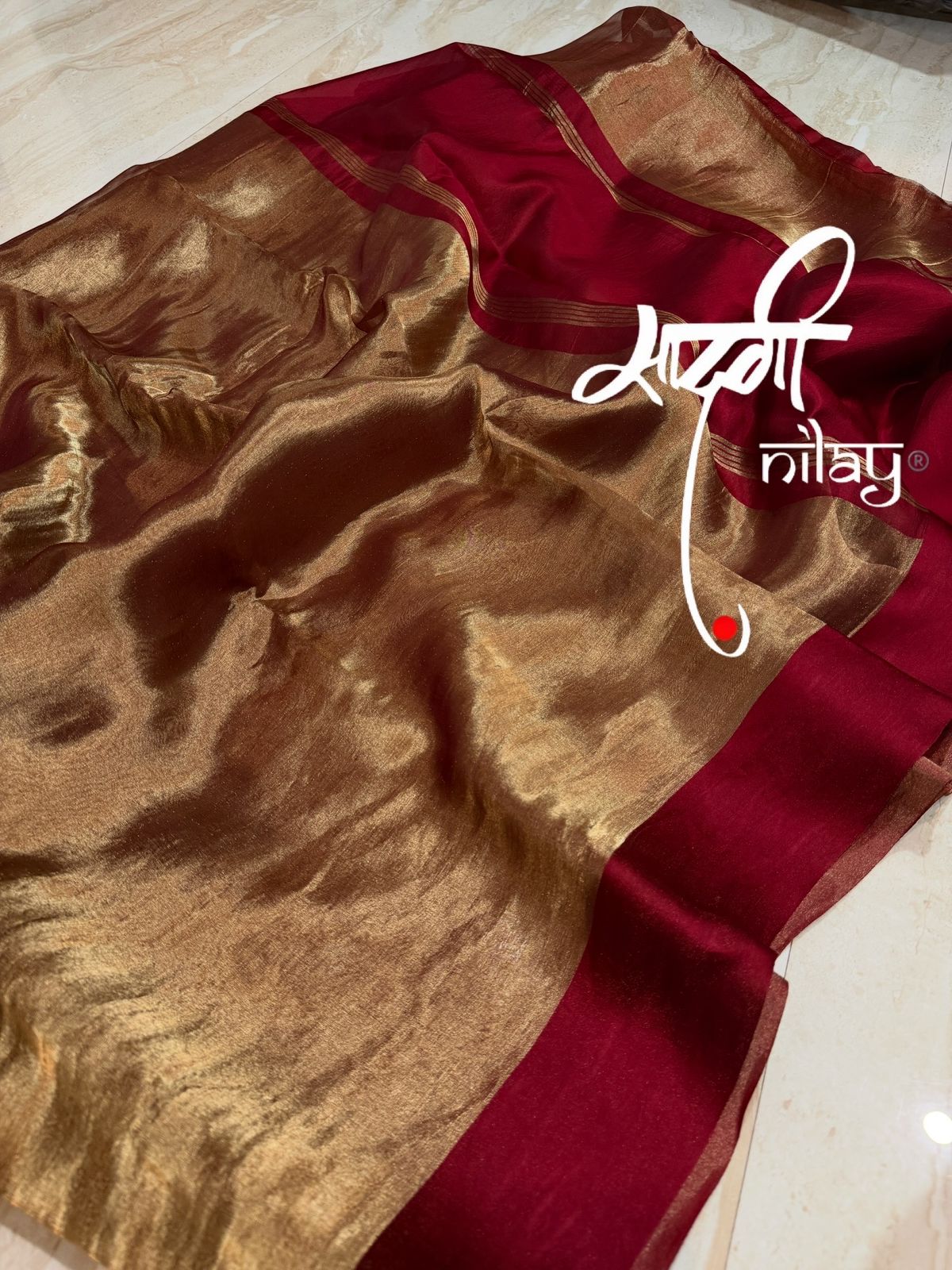 Crafted from premium metallic tissue silk, this saree features a luminous golden sheen that reflects light beautifully, creating a graceful and royal appearance. The rich satin patta border in a deep contrasting tone adds depth and sophistication, making it perfect for weddings, festive celebrations, receptions, and special occasions.