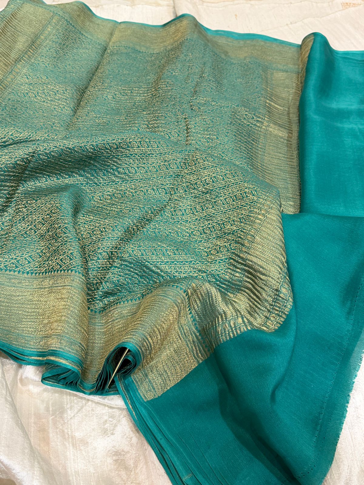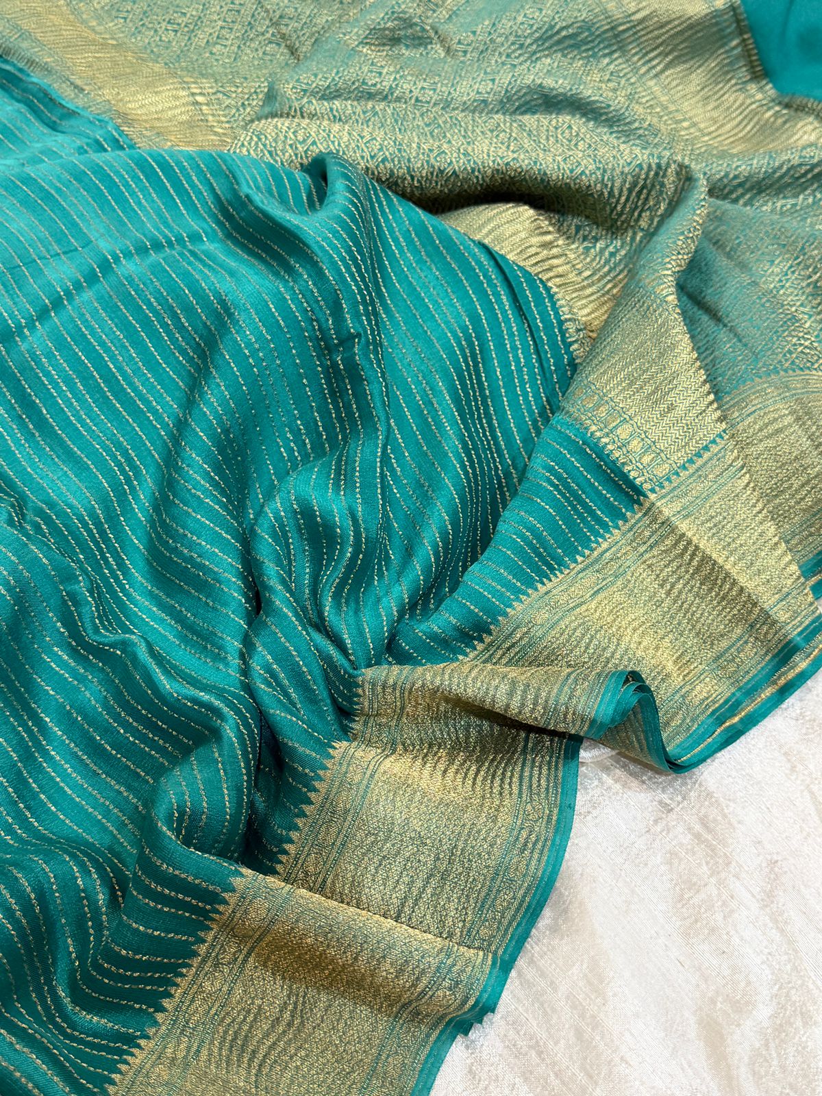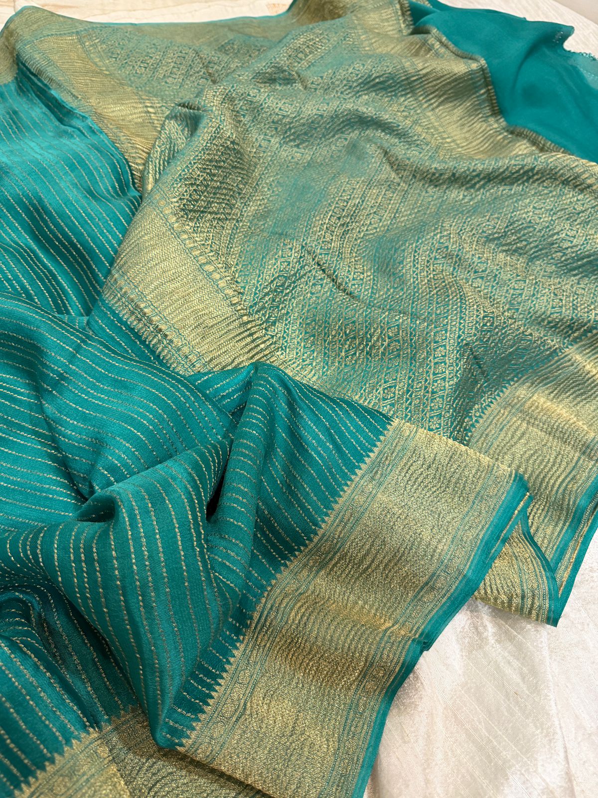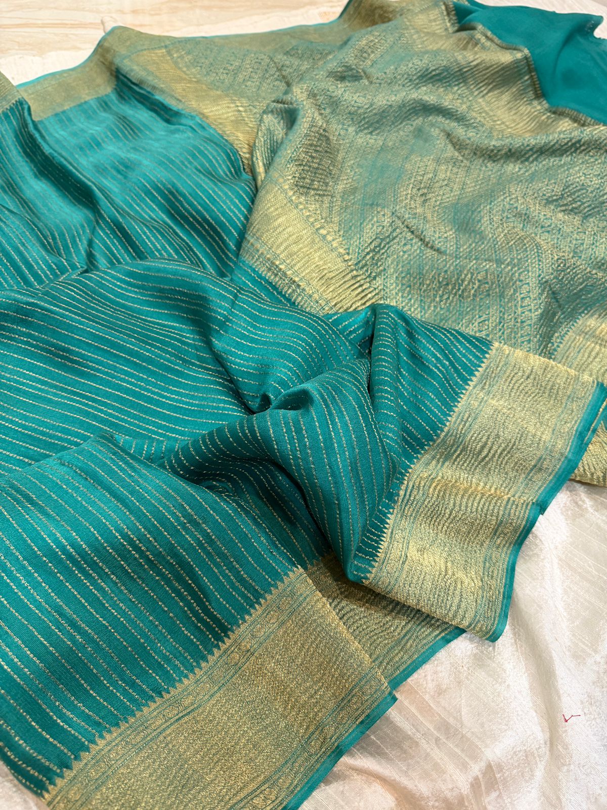 Crafted from premium crepe silk with a soft crushed texture, this saree drapes beautifully and exudes effortless grace. The intricate zari weave adds a touch of timeless luxury, making it perfect for festive occasions, weddings, or elegant evenings.