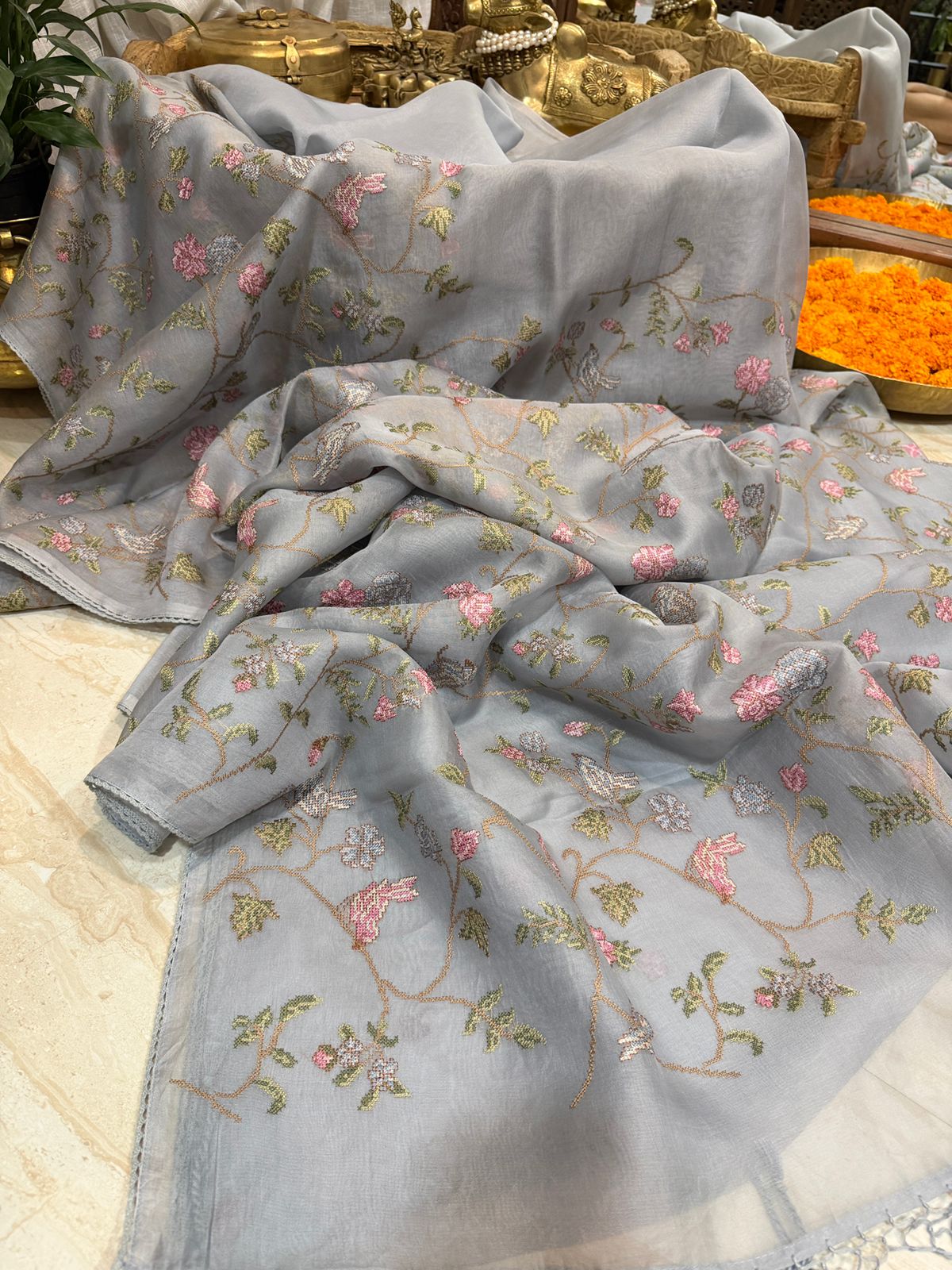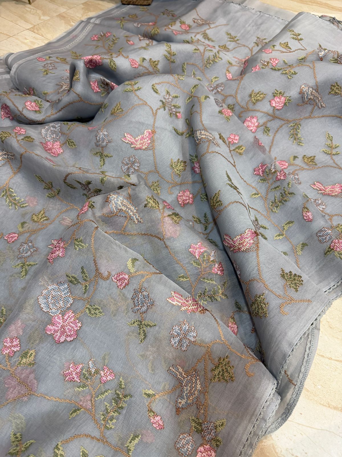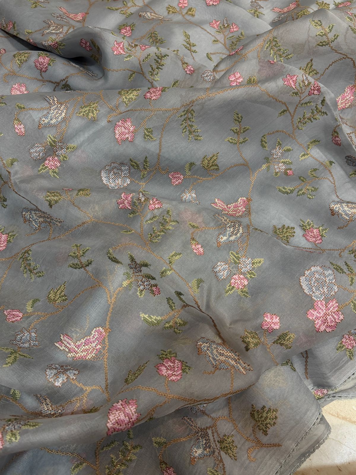 This exquisite saree is crafted from sheer, lightweight organza silk in a soft blush pink — a shade that radiates timeless femininity and grace. What makes this piece truly special is the all-over cross stitch embroidery that adorns every inch of the fabric, featuring a enchanting garden motif of roses, tulips, trailing vines, and tiny birds rendered in soft pinks, mauves, greens, and lavender.
