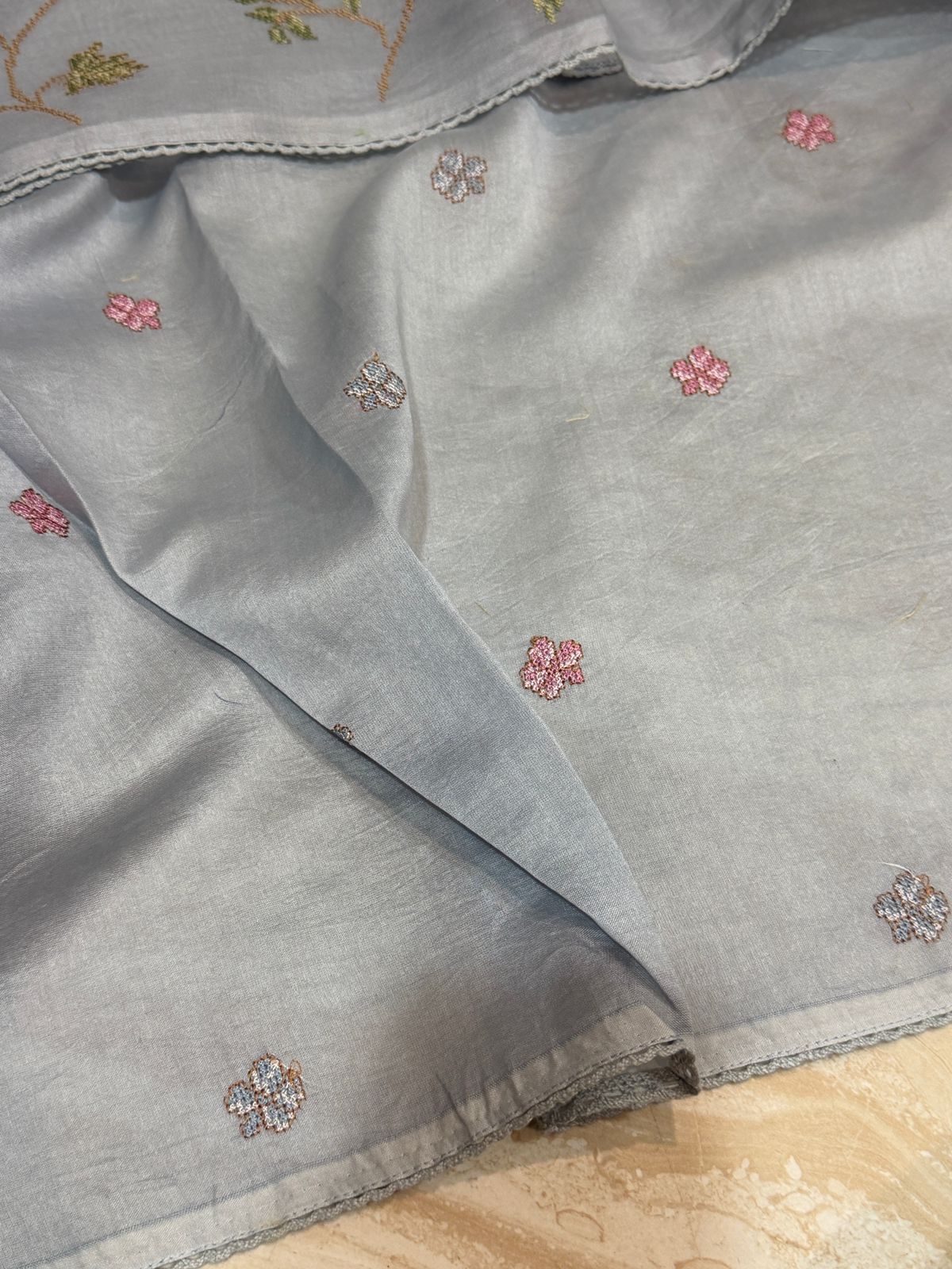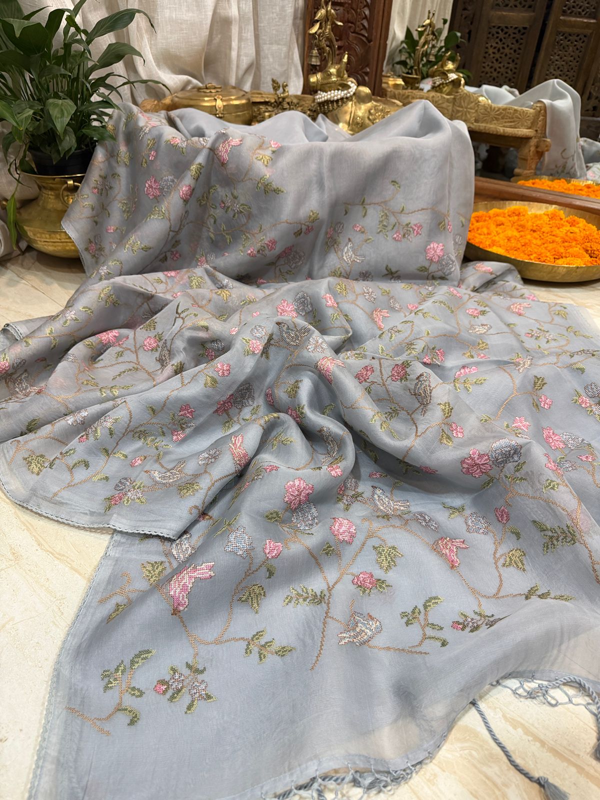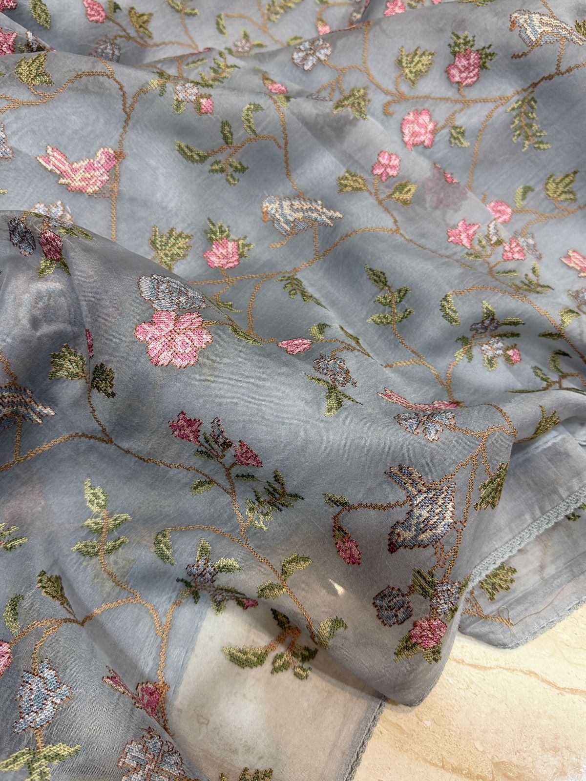 This exquisite saree is crafted from sheer, lightweight organza silk in a soft blush pink — a shade that radiates timeless femininity and grace. What makes this piece truly special is the all-over cross stitch embroidery that adorns every inch of the fabric, featuring a enchanting garden motif of roses, tulips, trailing vines, and tiny birds rendered in soft pinks, mauves, greens, and lavender.