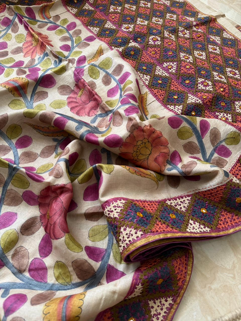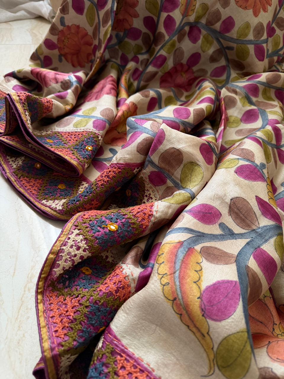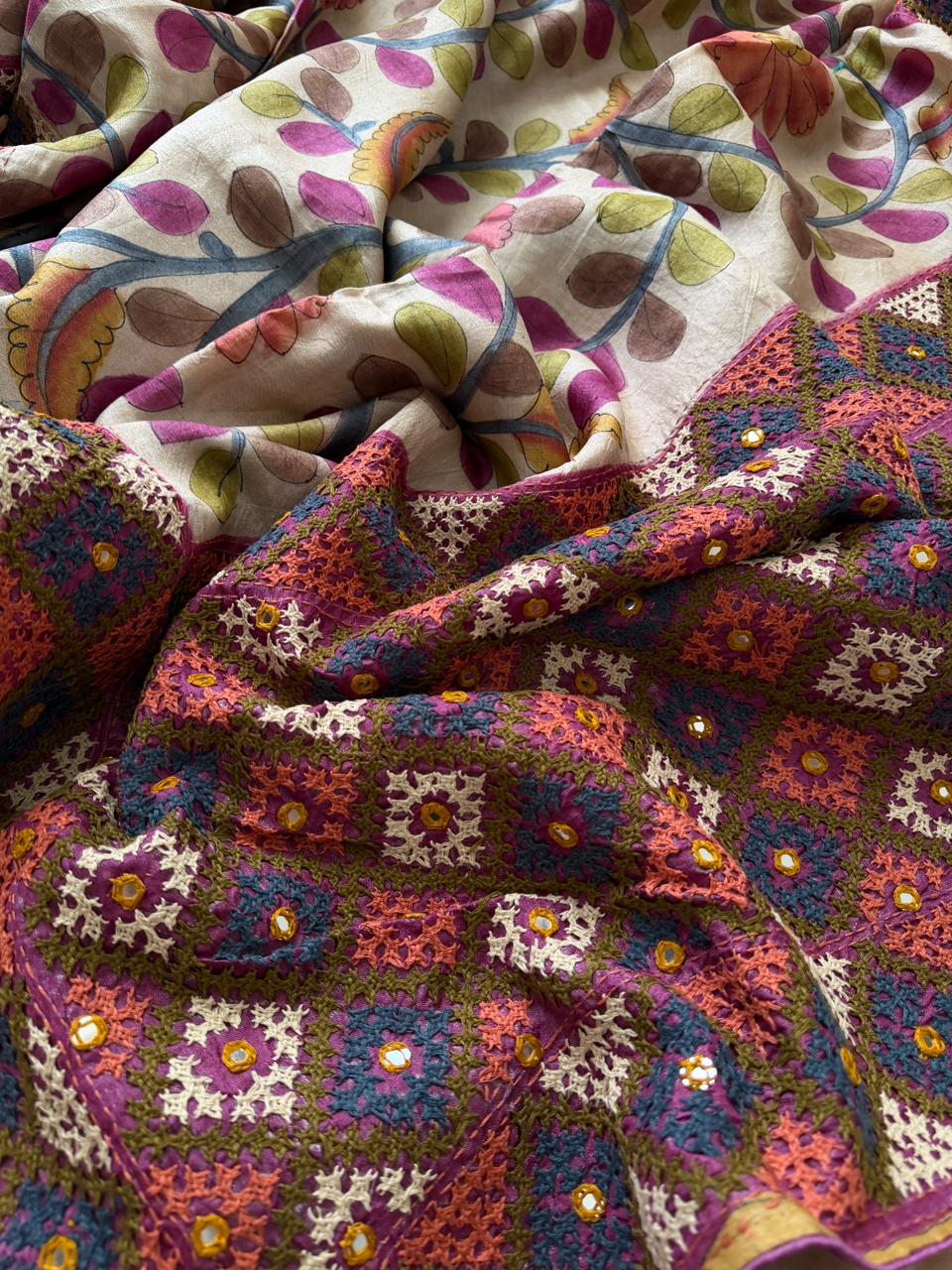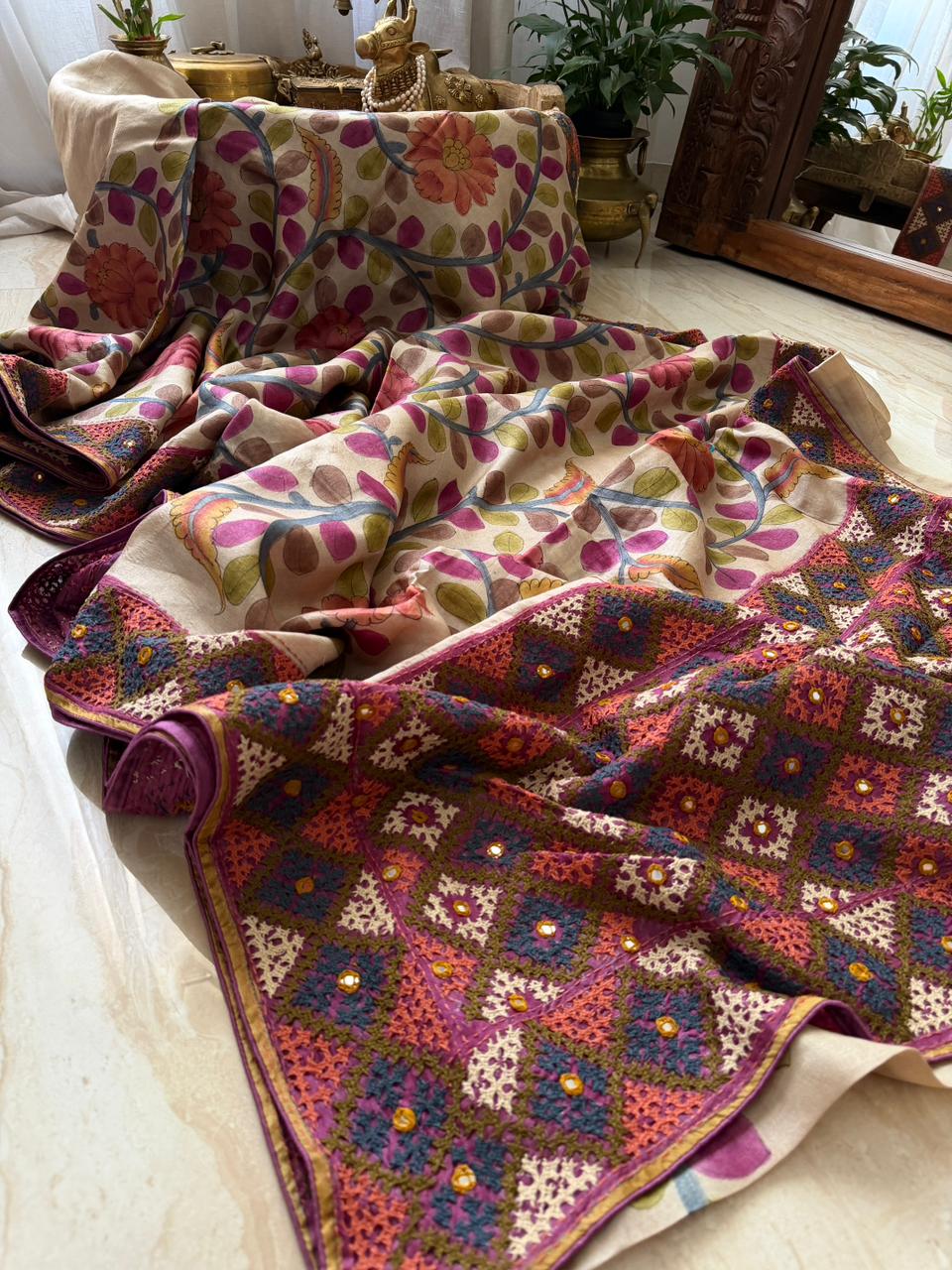 Work: Kalamkari hand-brush painting with Kutch embroidery