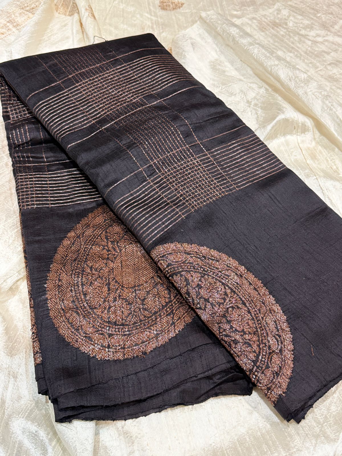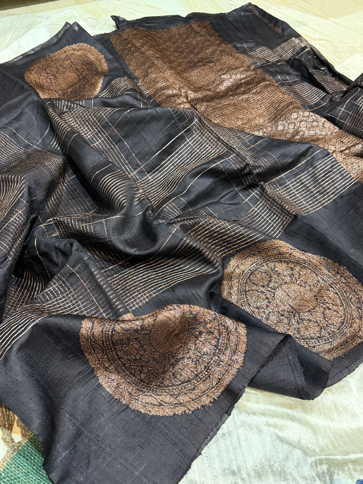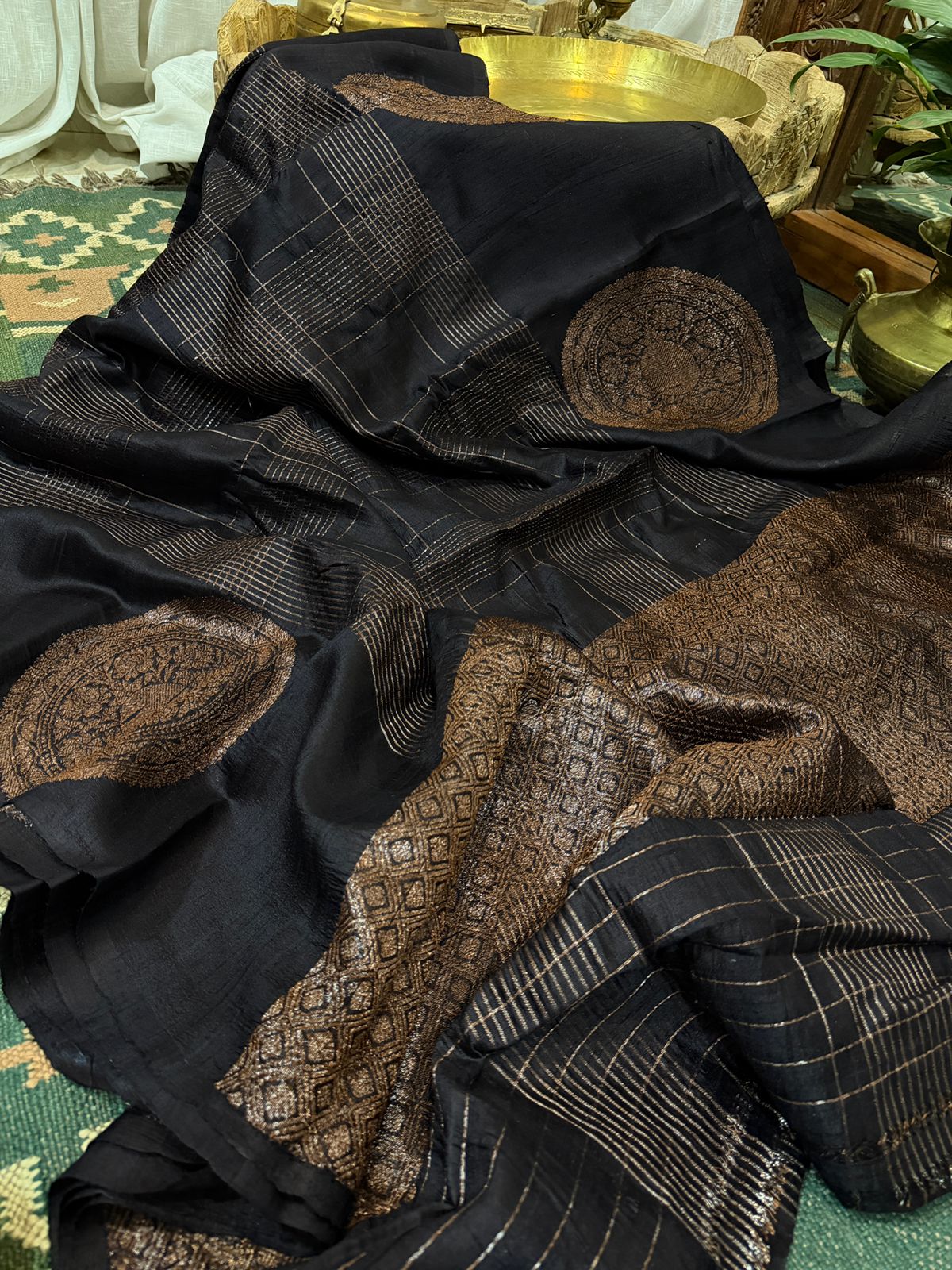 Beautiful shade of Tussar Raw Silk banarasi saree with Kudhua weave zari