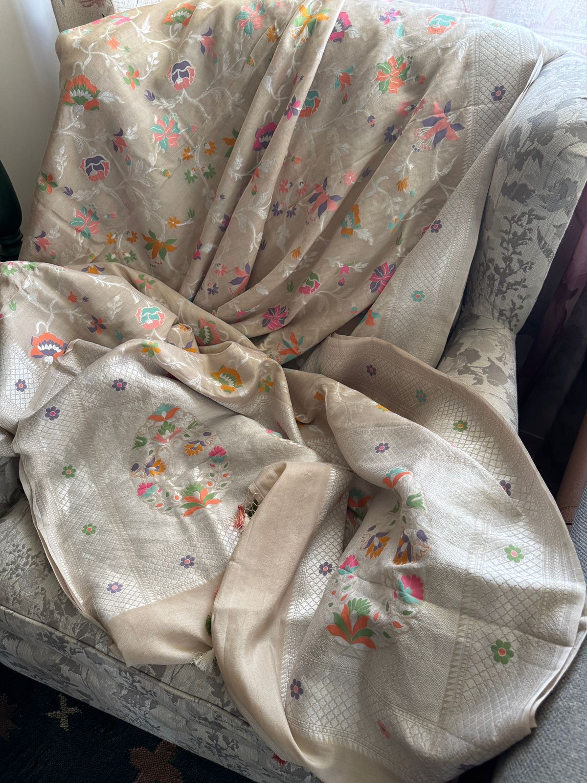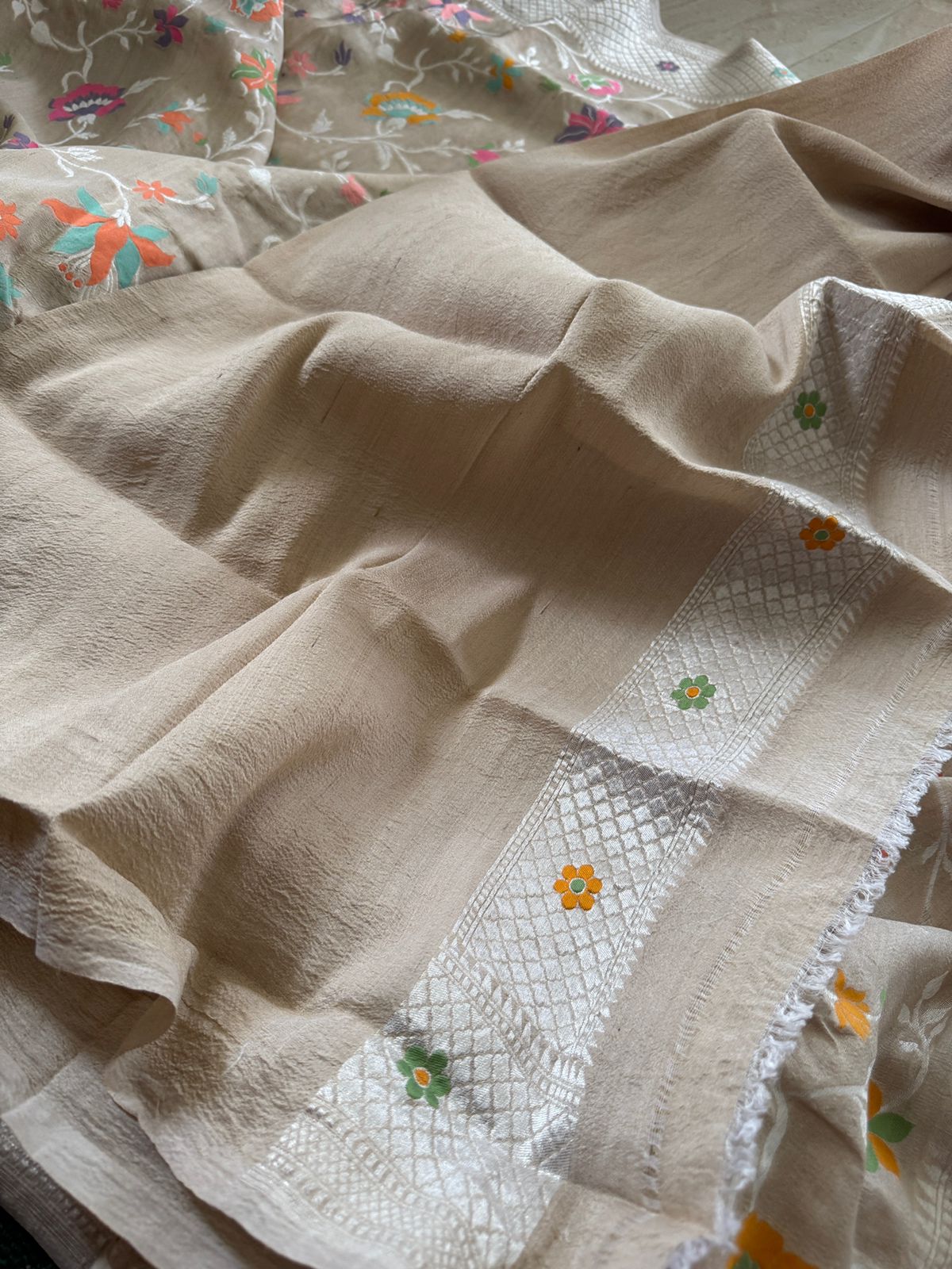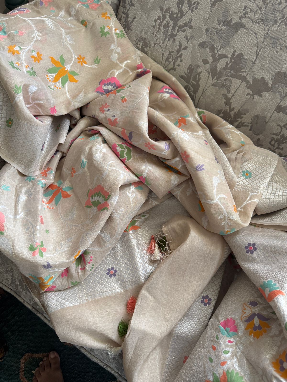 Design Detail: Pure tussar Georgette Handloom Banarasi Saree Weaving permanent handloom. The elaborate and laborious technique involves hand-weaving each separately. This takes longer on the handloom but creates a more robust pattern, which stands on the fabric.