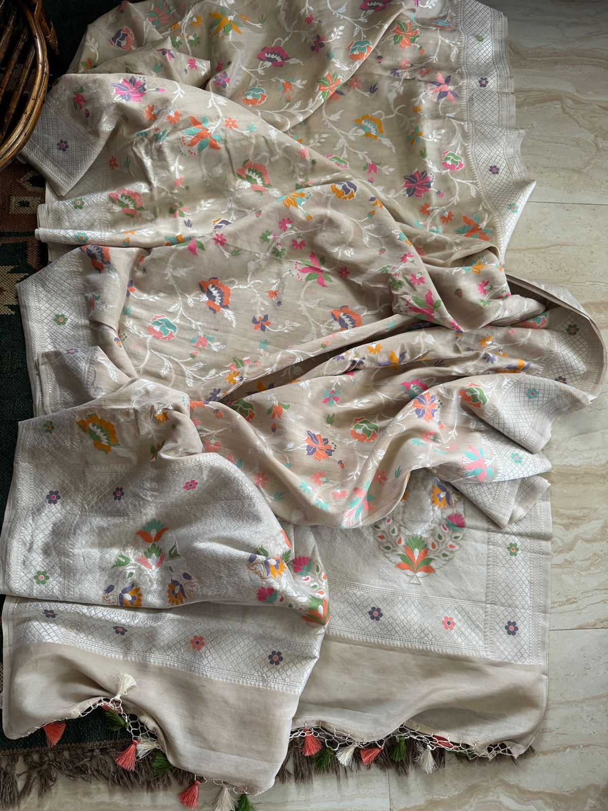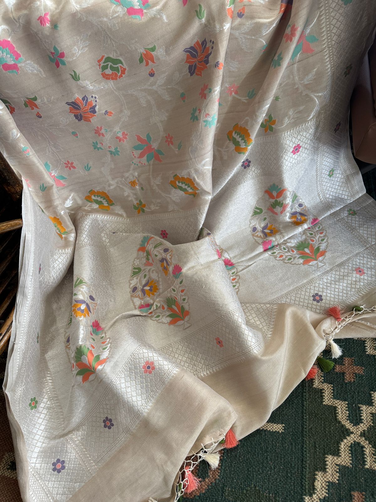 Pure banarasi handloom tussar georgette saree in off white colour. Saree has a delicate water zari border with tussar georgette unique Motifs near pallu. The entire saree is beautiful with water zari meenakari design. It is an elegant traditional Banarasi saree. Irresistible wedding collection. This Mesmerising Saree is a Combination of Elegance and Style.