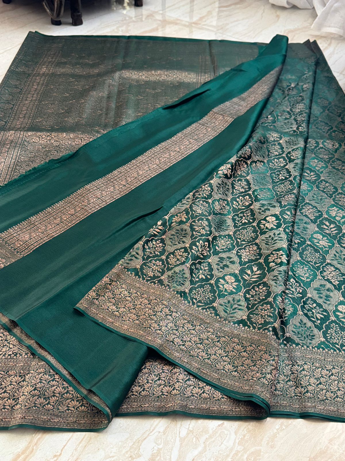 Radiance in six yards! Exclusive Pure Crepe Silk Sarees with nestling zari design weaves which is intricately crafted brocade adds timeless appeal.