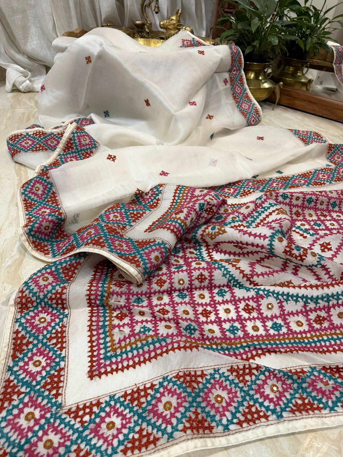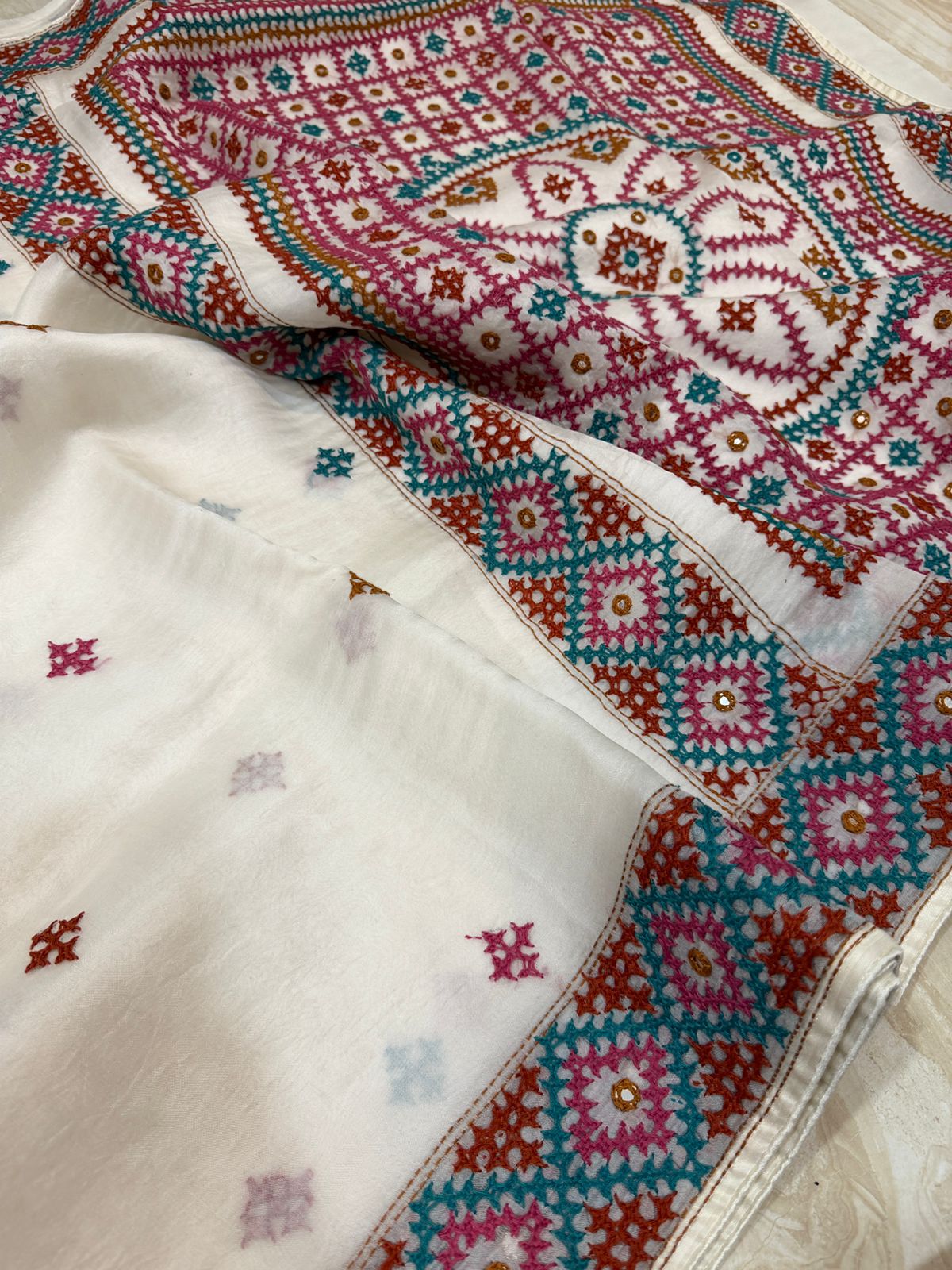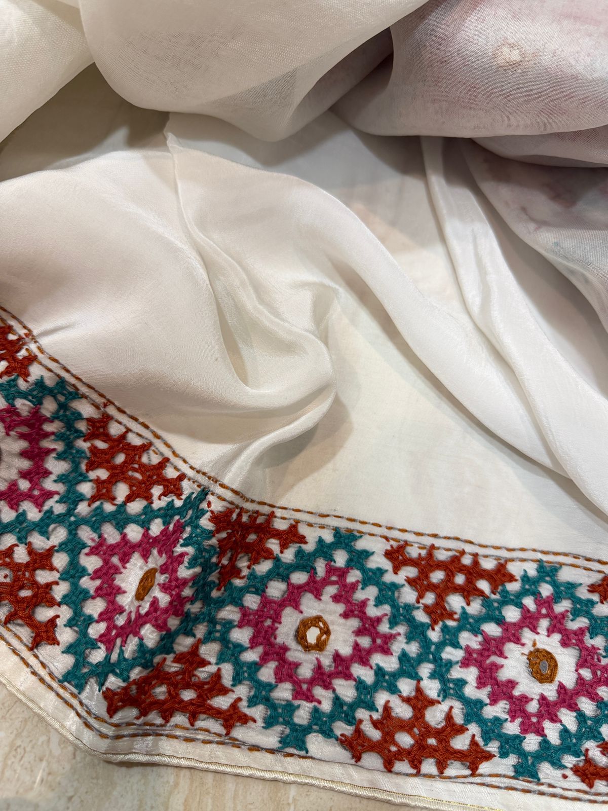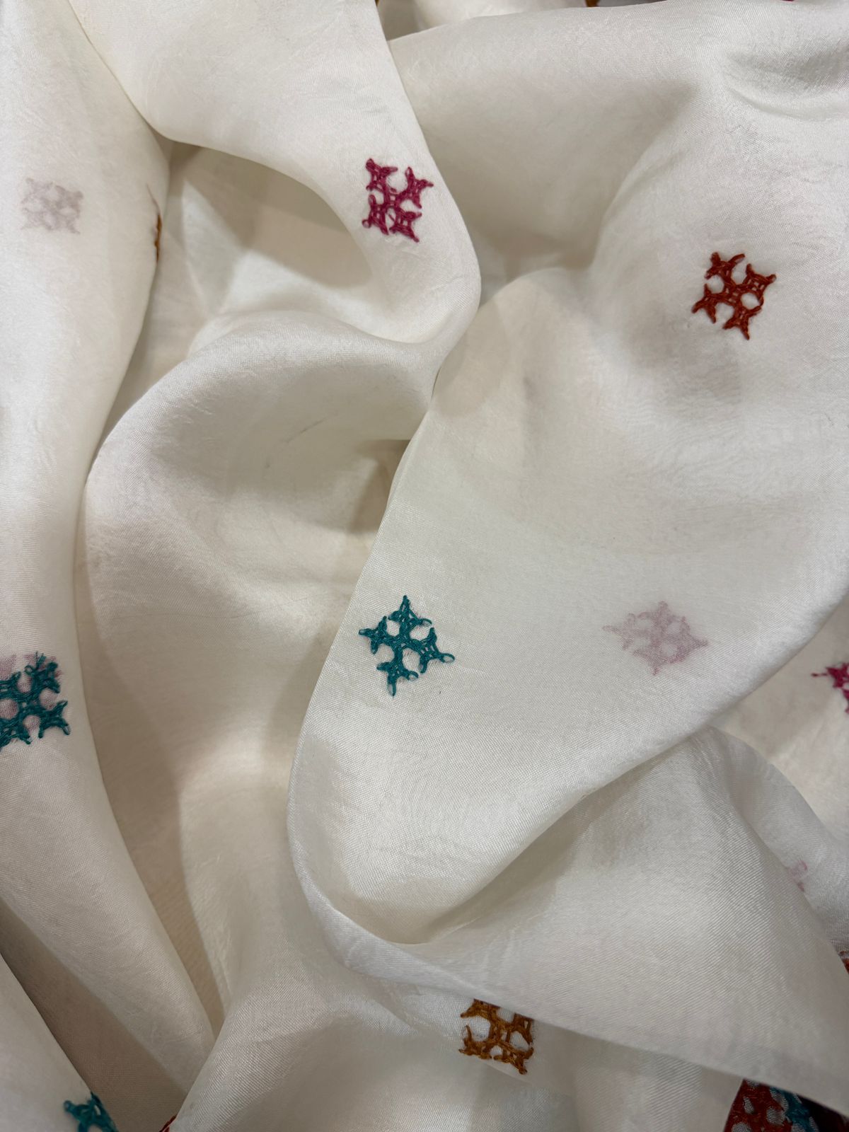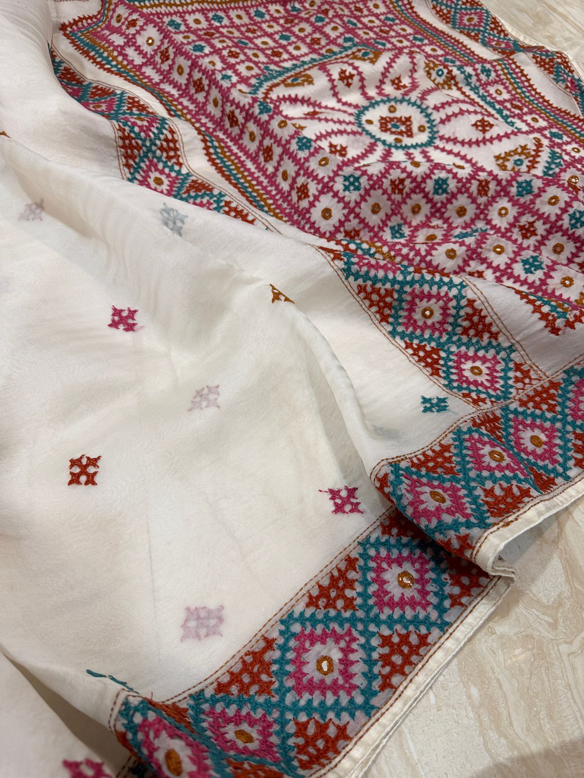 The highlight of this saree is its exquisite Kutch hand embroidery, intricately done along the border and pallu. Vibrant geometric motifs in rich jewel tones reflect the rich heritage of Kutch, creating a striking contrast against the pristine ivory base. Delicate embroidered buttas scattered across the body enhance its understated charm.