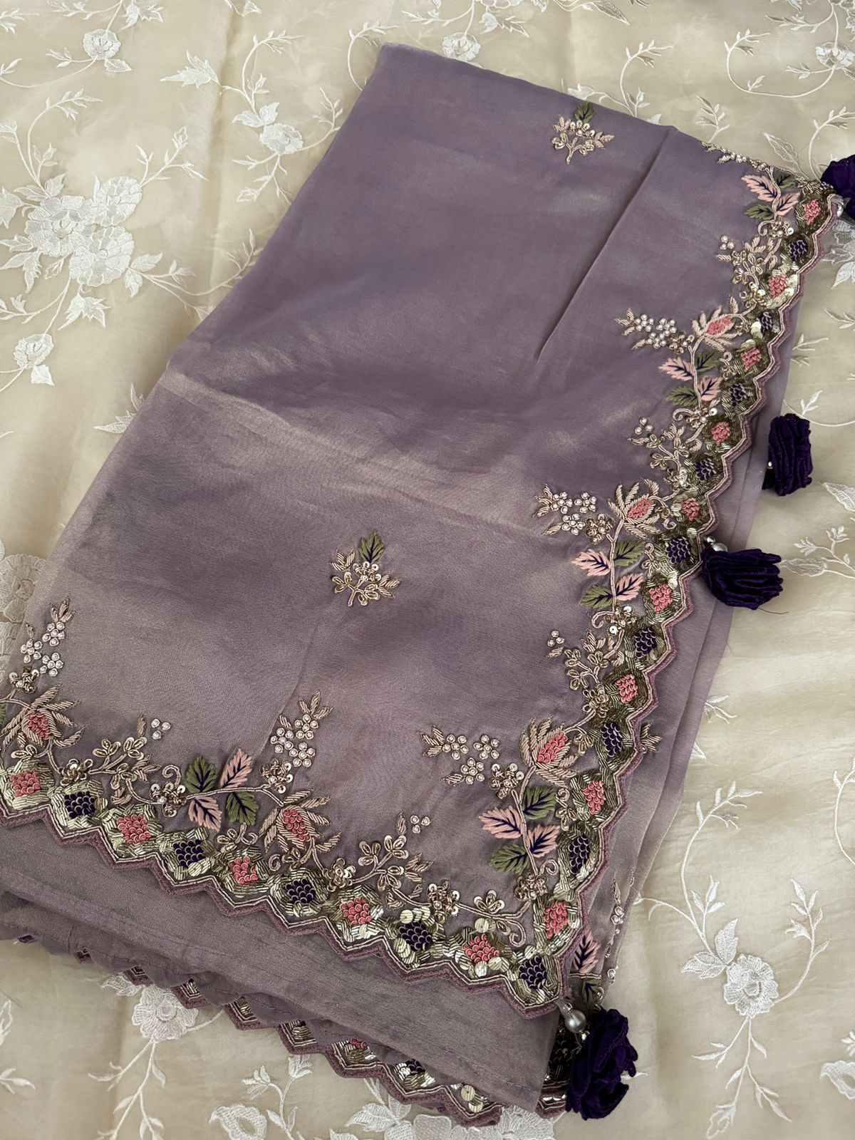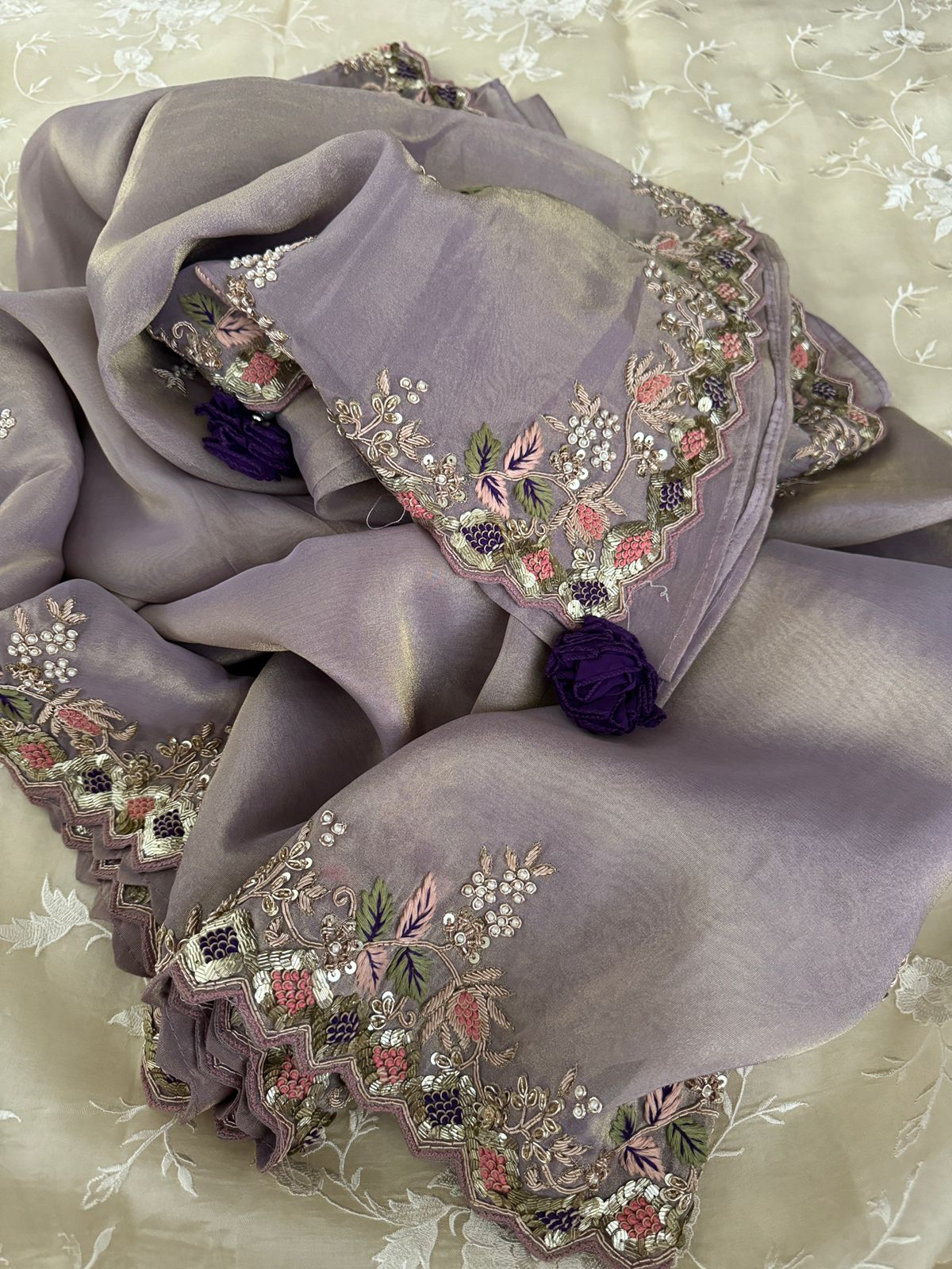 The lightweight tissue silk drapes effortlessly, giving you an elegant silhouette while the intricate Zardozi detailing highlights the saree’s artisanal craftsmanship. Ideal for weddings, festive occasions, receptions, and special celebrations, this masterpiece promises a statement look with refined sophistication.